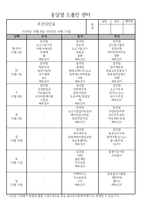 ¿Ë´Þ»ùµå·ÓÀμ¾ÅÍ 2025³â 10¿ù 1ÁÖÂ÷ ½Ä´ÜÇ¥