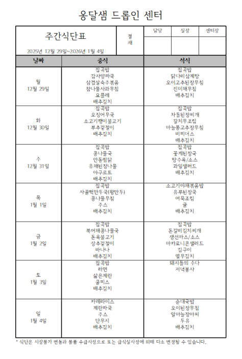 ¿Ë´Þ»ùµå·ÓÀμ¾ÅÍ 2025³â 12¿ù 1ÁÖÂ÷ ½Ä´ÜÇ¥